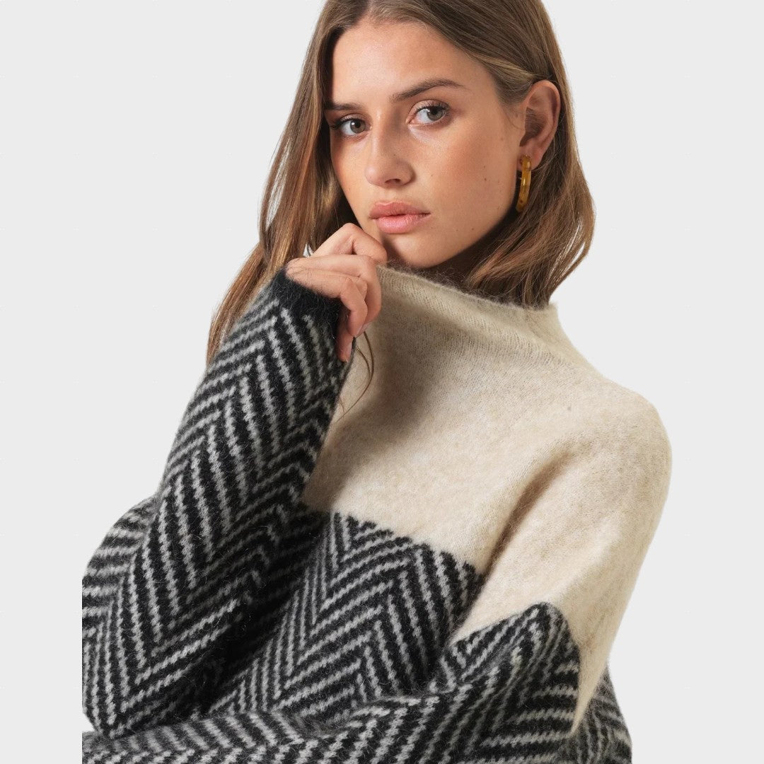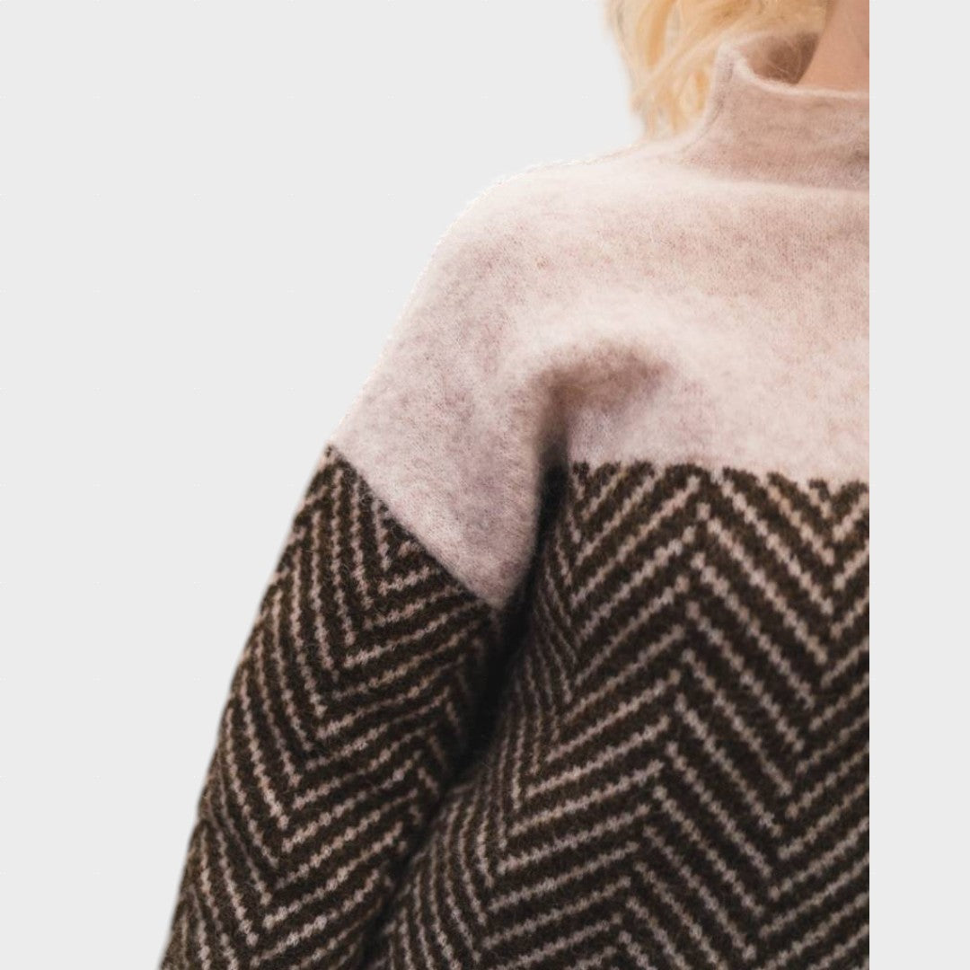 Šis megztinis su originaliu raštu ir moderniu siluetu yra skirtas moteriai, kuri vertina unikalumą. Stilingas aukštas kaklas suteikia papildomos šilumos bei elegancijos, o rašto kontrastas – tai subtili detalė, kuri pabrėžia jūsų individualumą. Puikiai tinka tiek jaukiam savaitgalio poilsiui, tiek miesto pasivaikščiojimams.