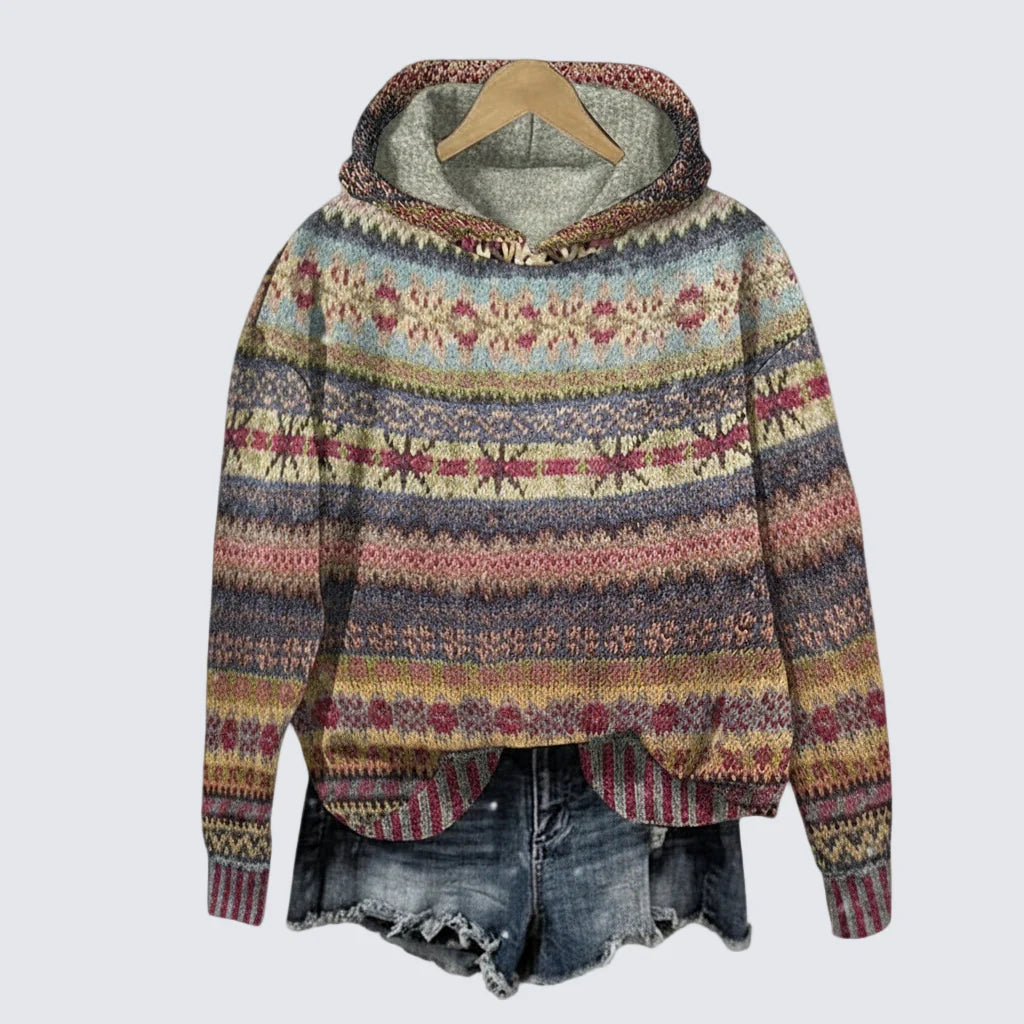 Modelis: laisvo kirpimo megztinis su gobtuvu, suteikiantis jaukumo ir apsaugos nuo šalčio.