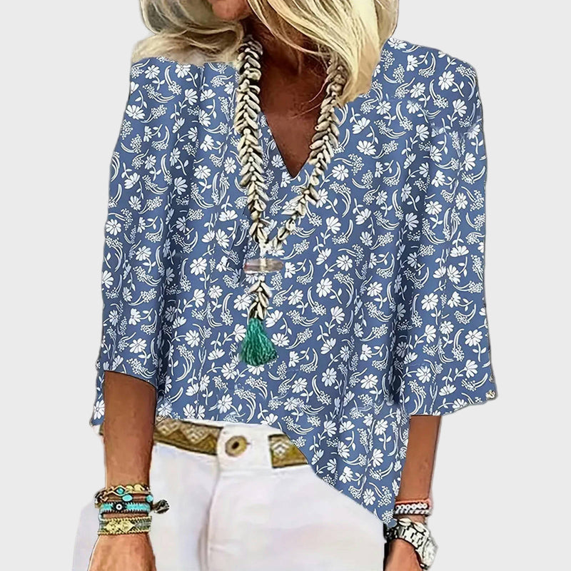 Atnaujinkite savo kasdienį įvaizdį su šia mėlyna palaidine, dekoruota mažais baltais gėlių raštais. Klasikinis jos dizainas su trimis ketvirtadaliais rankovėmis suteikia patogumo ir elegancijos, o laisvas siluetas ją daro idealia pasirinkimo visoms dienos valandoms.